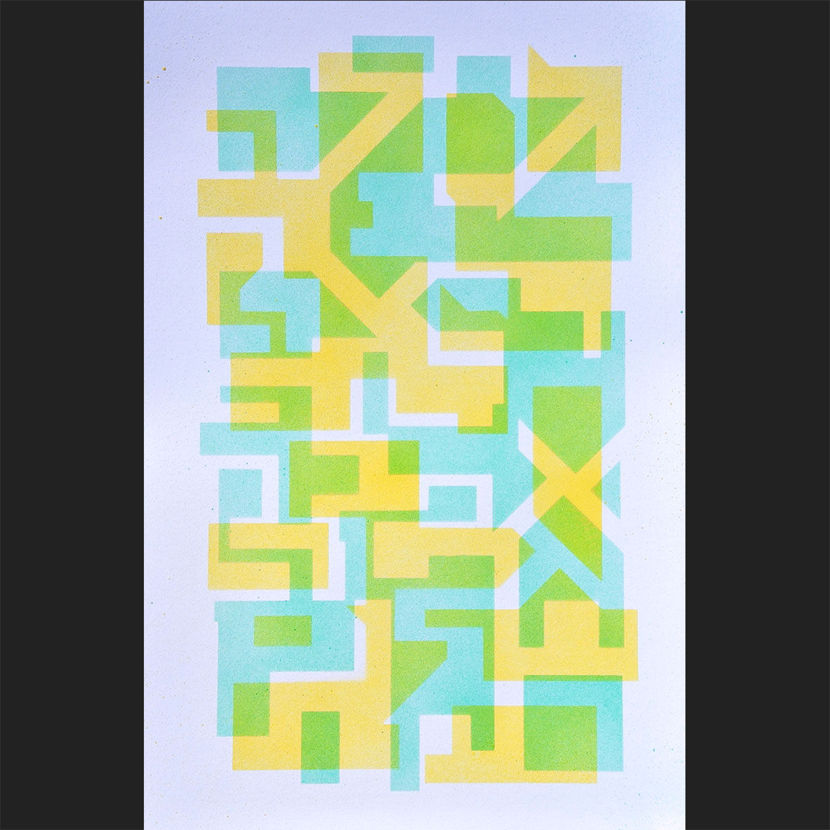 The final of the Sheva B'rachot, or seven blessings recited at a Jewish wedding, recognizes God as having created joy, song, delight, celebration, love, harmony, peace, and companionship. Those eight words—gilah, rinah, ditzah, chedvah, ahavah, achavah, shalom, reut—are formed here by the overlap of the two colors, as it is through partnership that they come into being.