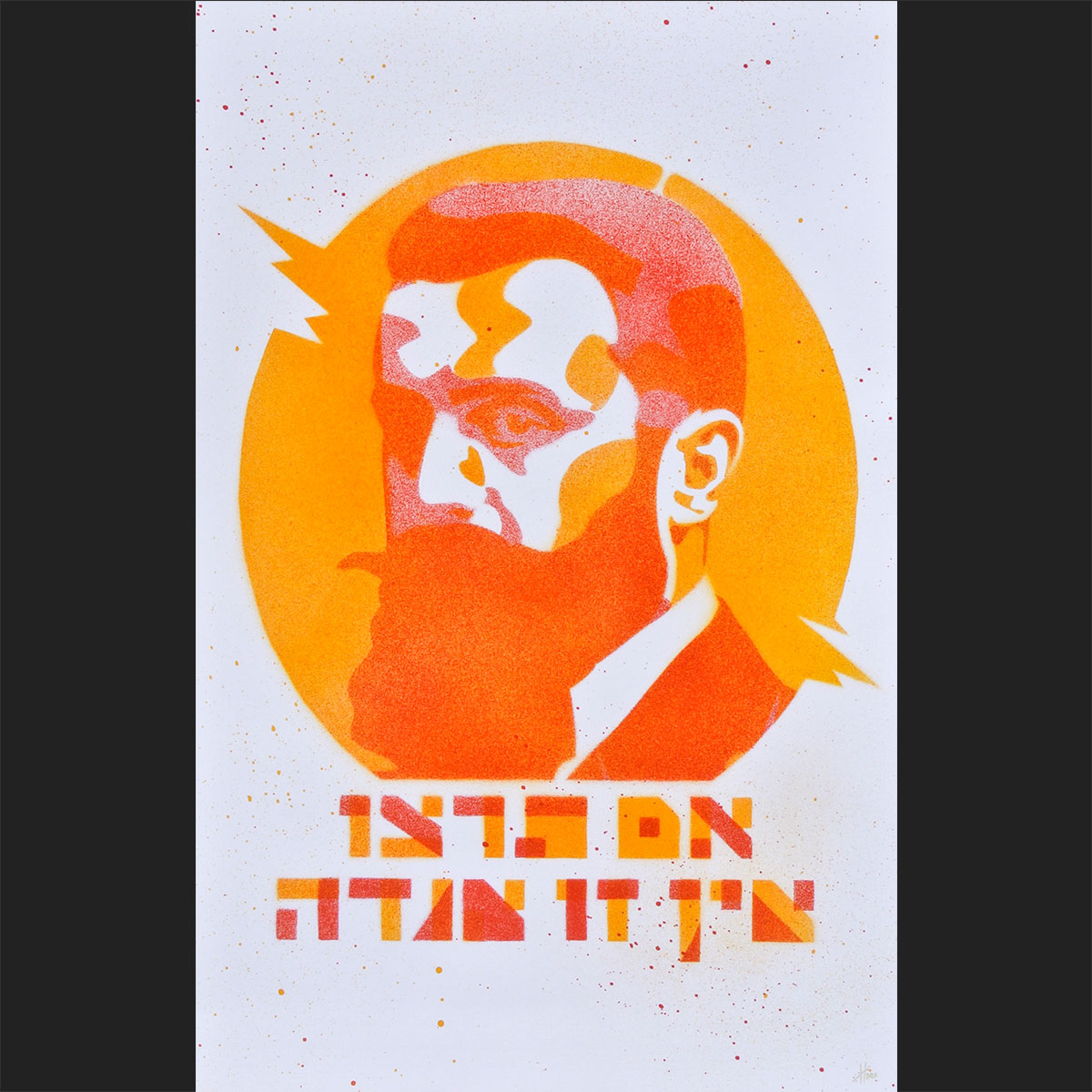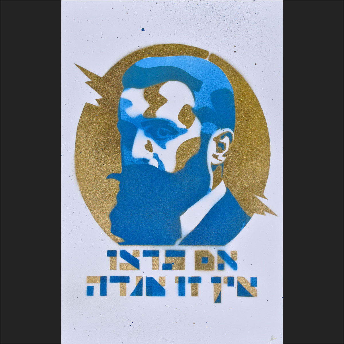 Theodor Herzl, with his famous quote "If you will it, it is no dream" (in Hebrew אִם תִּרְצוּ, אֵין זוֹ אַגָדַה, translated from the original German). The type is hand-designed in a set up that only works when the two layers line up.
