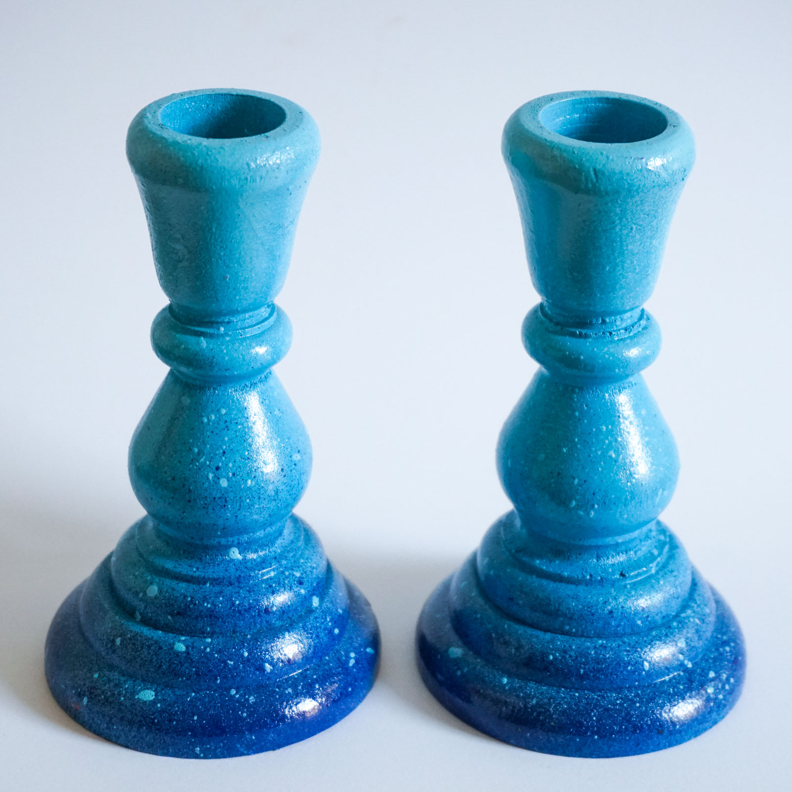 Hand-painted wooden candlesticks stand about 4" tall and are signed.