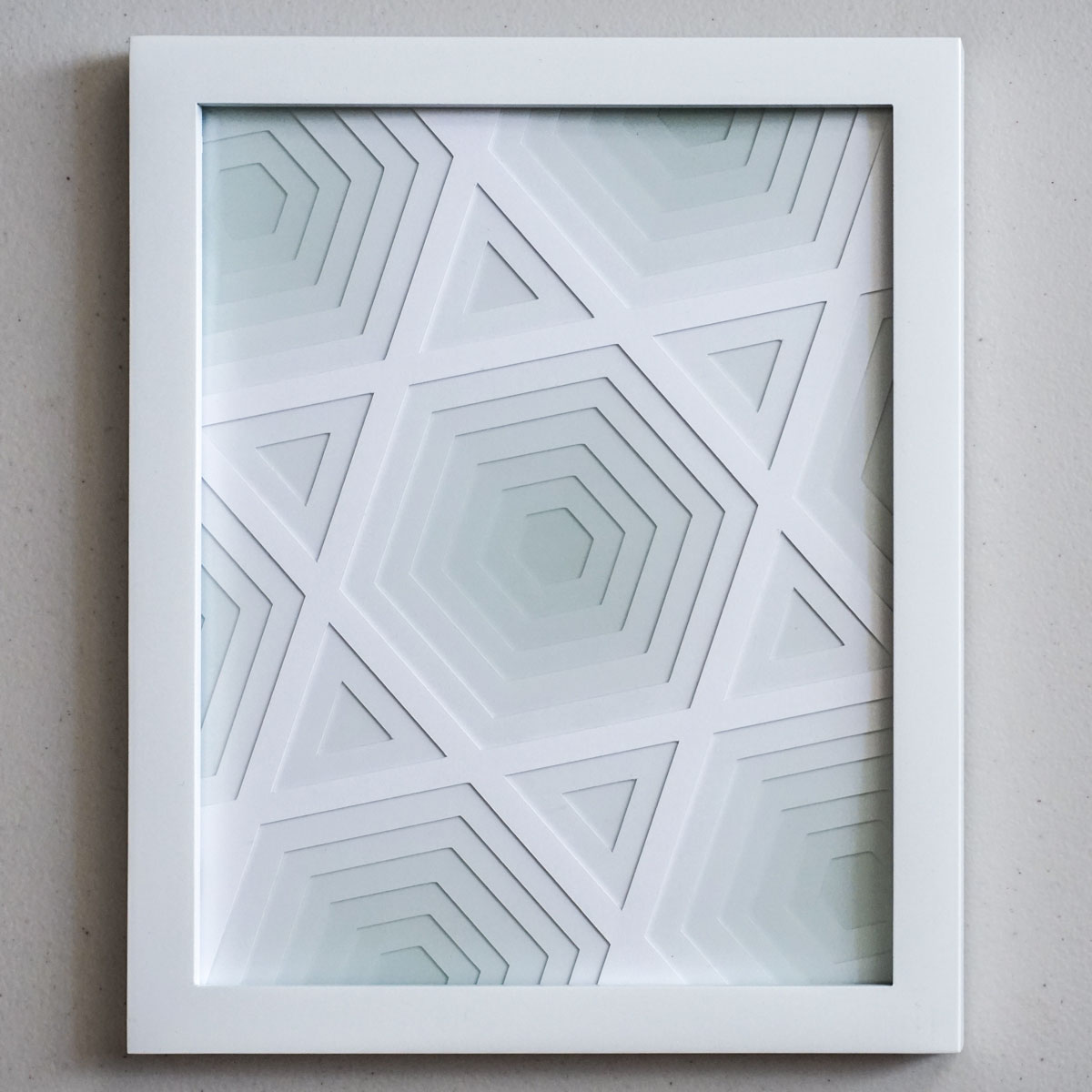7-layer papercut in the shape of a 3-dimensional Jewish star. Framed and ready to hang.