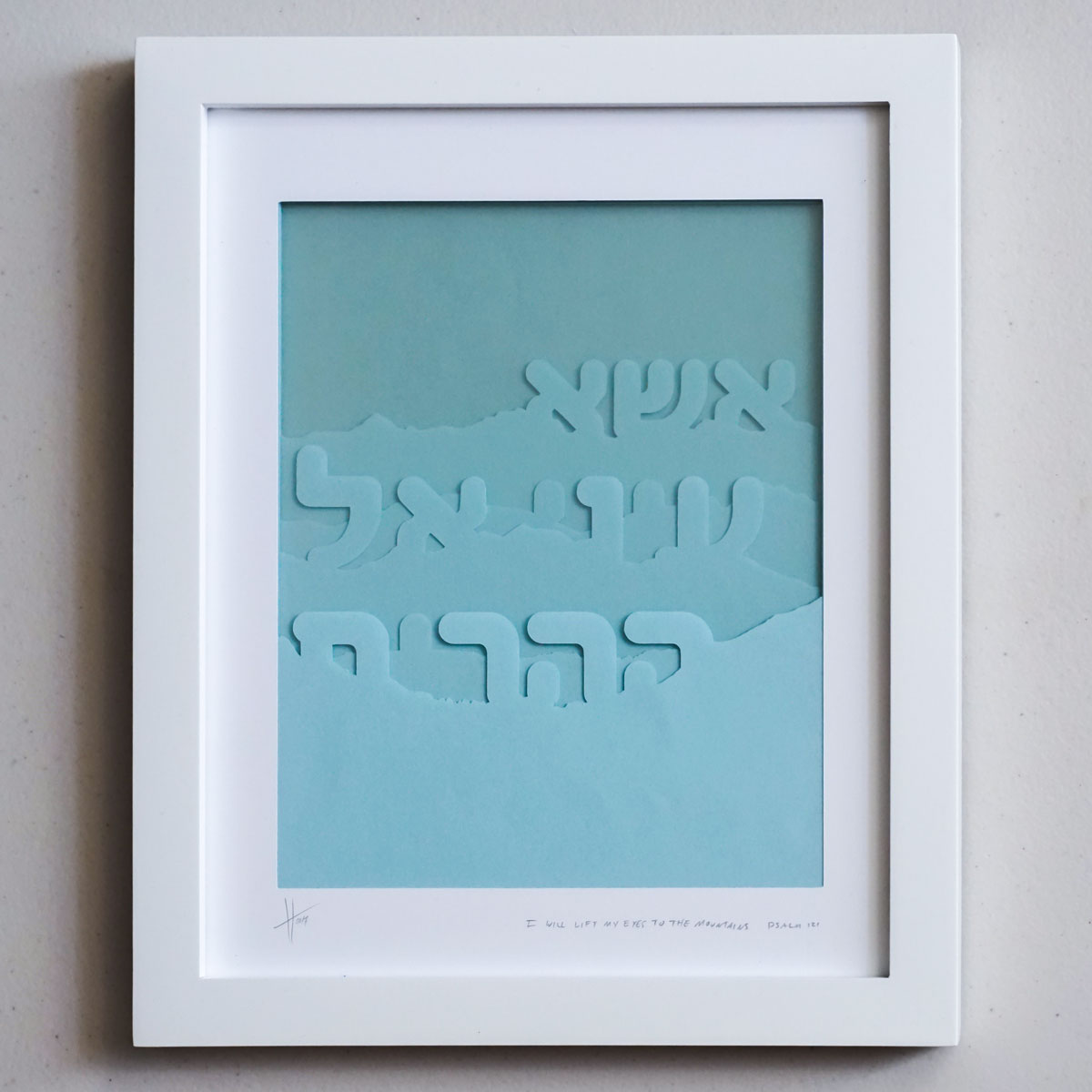 (Esa einai el he-harim) — I will lift up my eyes to the mountains. The letters emerge from mountaintops receding into the distance.
