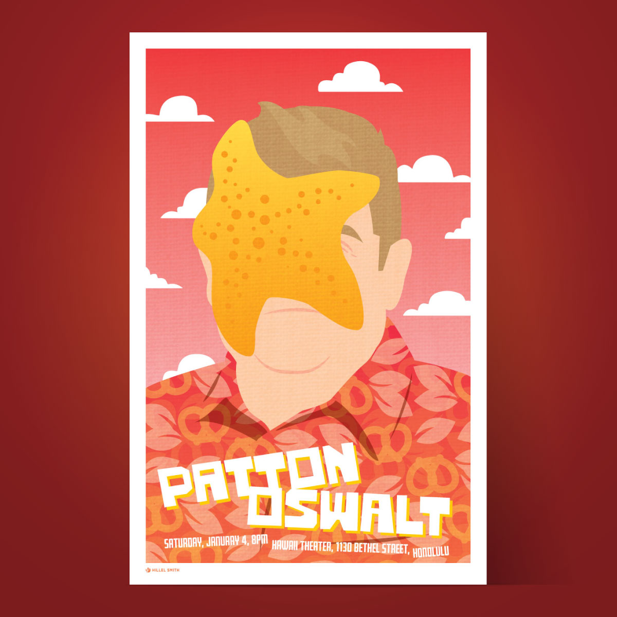 Poster for Patton Oswalt's comedy show at the Hawaii Theatre in Honolulu, Hawaii. He's having a fun day at the beach, dammit.